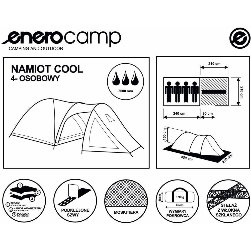 Jeżeli potrzebujesz przenośnej sypialni, uwielbiasz kempingi i noclegi na łonie natury to NAMIOT TURYSTYCZNY 4 OSOBOWY COOL ENERO CAMP będzie idealny.