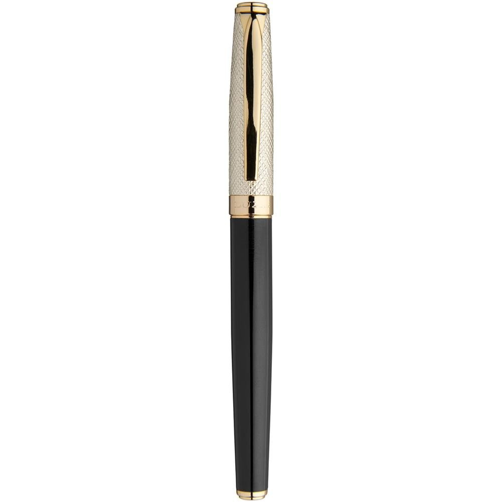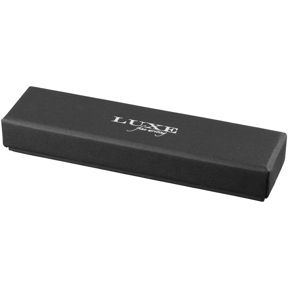 Luksusowe pióro kulkowe, ze złotą skórzaną zatyczką i lakierowanymi złotymi elementami, zapakowane w pudełko upominkowe Luxe.