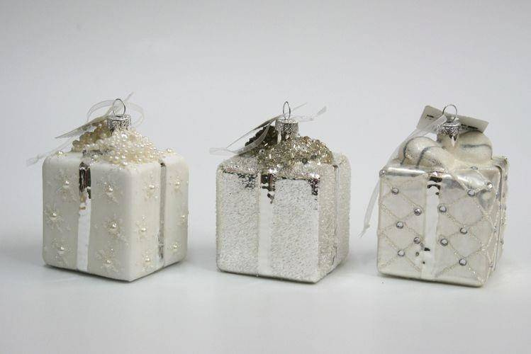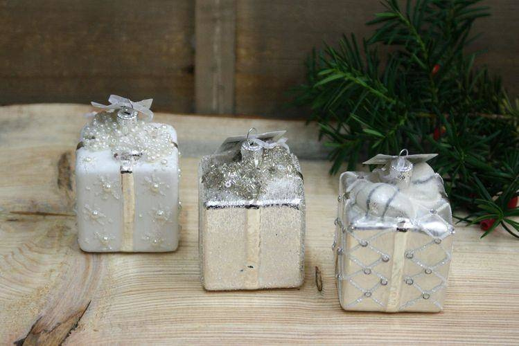 Komplet 3 świątecznych zawieszek/bombek w formie paczek prezentowych.