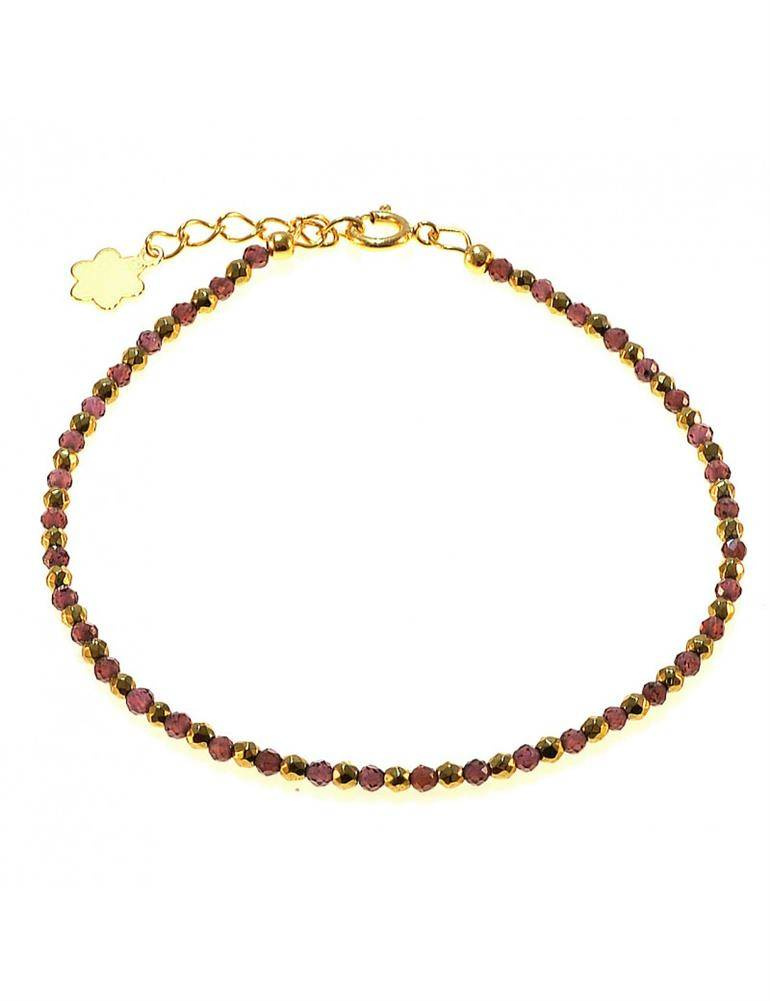 Bransoletka wykonana ze srebra próby 925 , pozłacanego 24 karatowym, żółtym złotem Kamień: Rubin + Hematyt Rozmiar kamienia ok 2 mm Długość :17,5 cm + przedłużka do 19,5 cm Produkt