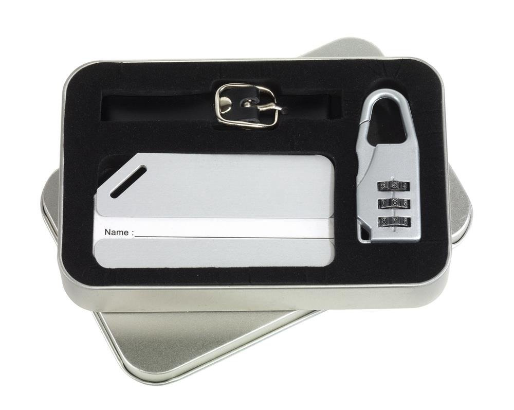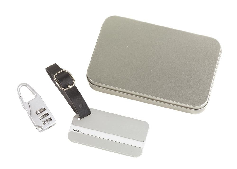 Zestaw do bagażu Far away składa się z aluminiowej zawieszki do bagażu z wyjmowanym polem na adres, paska z klamrą do mocowania do bagażu, zamka szyfrowego z