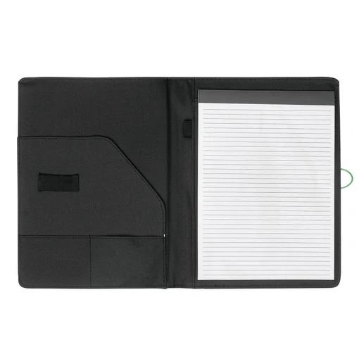 Portfolio Session w formacie DIN A4, zawiera notes, pętelkę na przybory do pisania, różne wsuwane kieszenie, metalowy haczyk z kolorową gumką do zamknięcia.