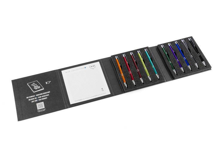 Nowoczesny i elegancki wzornik mieszczący 10 najpopularniejszych metalowych długopisów z oferty Blue Collection.