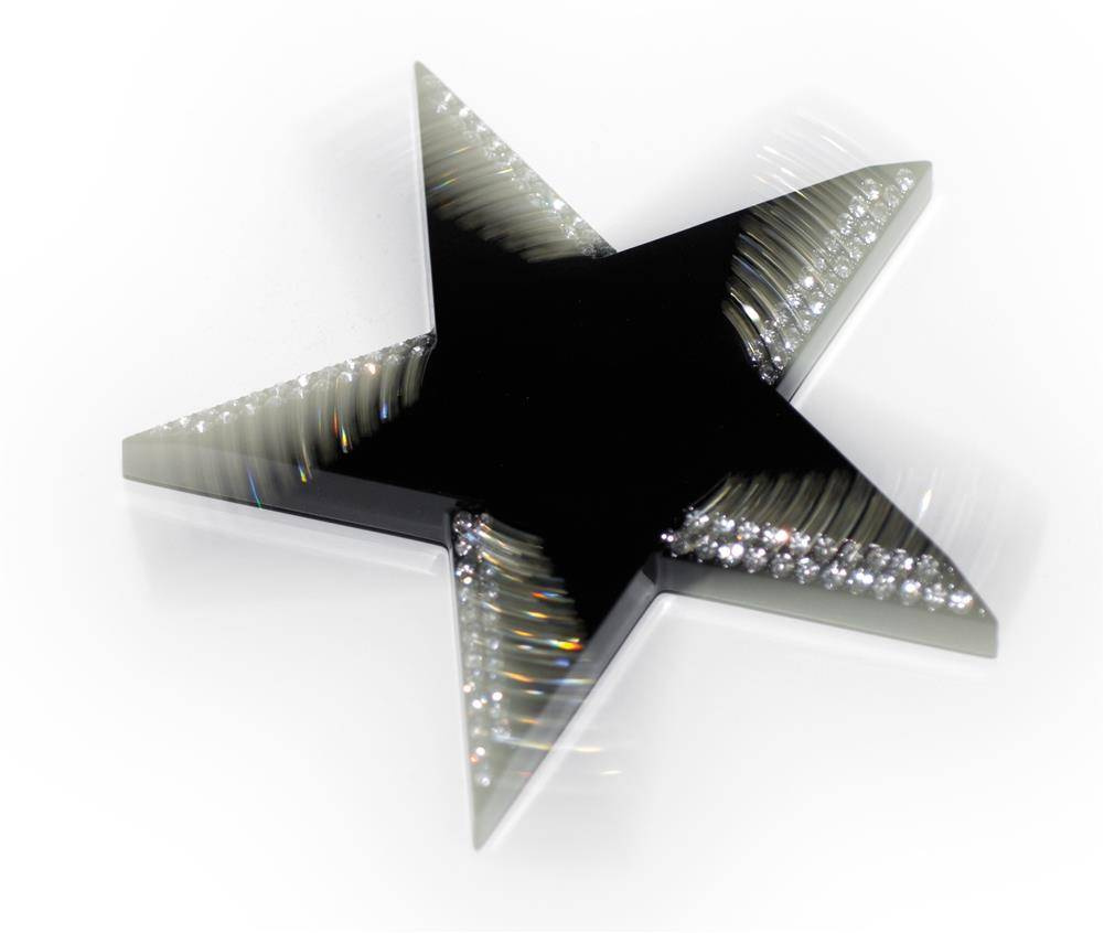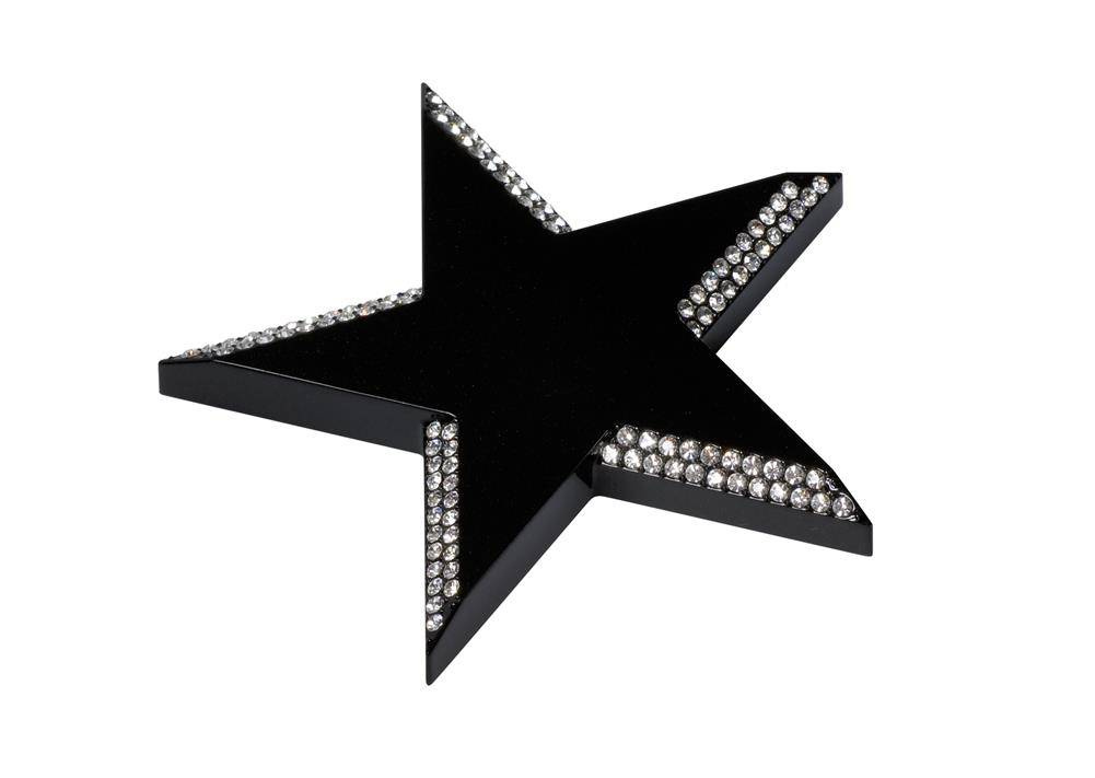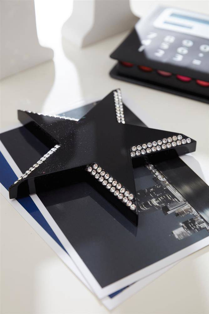 Przycisk do papieru TRONDHEIM, obrotowy, wykonany z ciężkiego czarnego metalu, w kształcie gwiazdy ozdobionej błyszczącymi kryształkami.