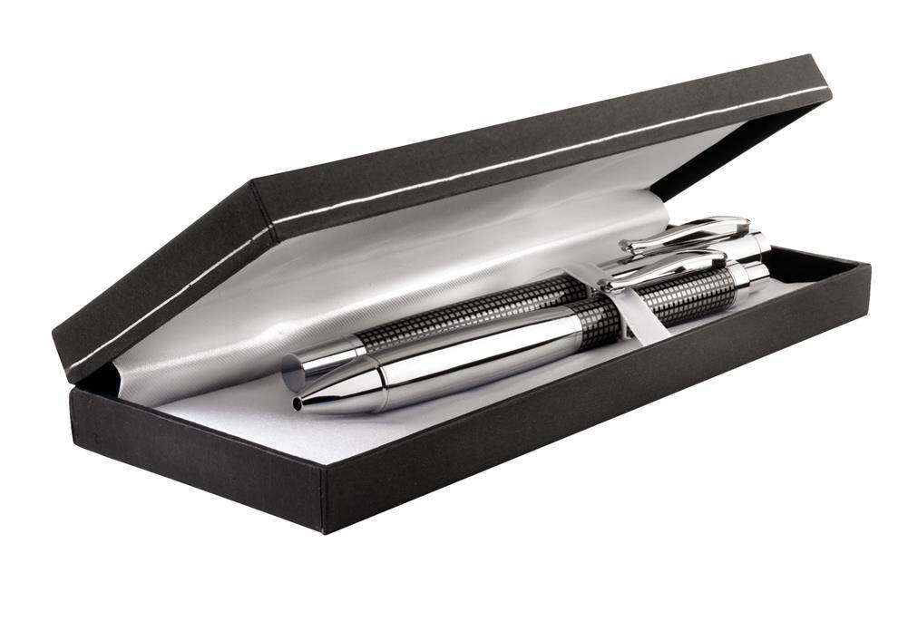 - metalowe pióro wieczne i długopis z mechanizmem przyciskowym (niebieski tusz),