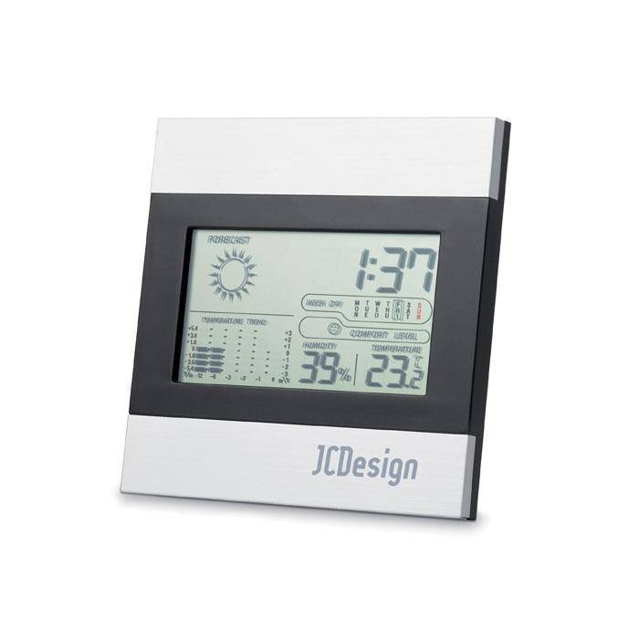 Stylowa srebrno-czarna stacja pogodowa, z zegarem, kalendarzem, wskaźnikiem temperatury i poziomu wilgotności.