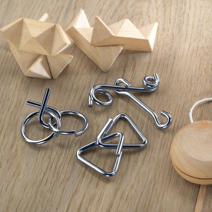 Zestaw 3 łamigłówek z metalu zapakowanych w bawełniany woreczek.