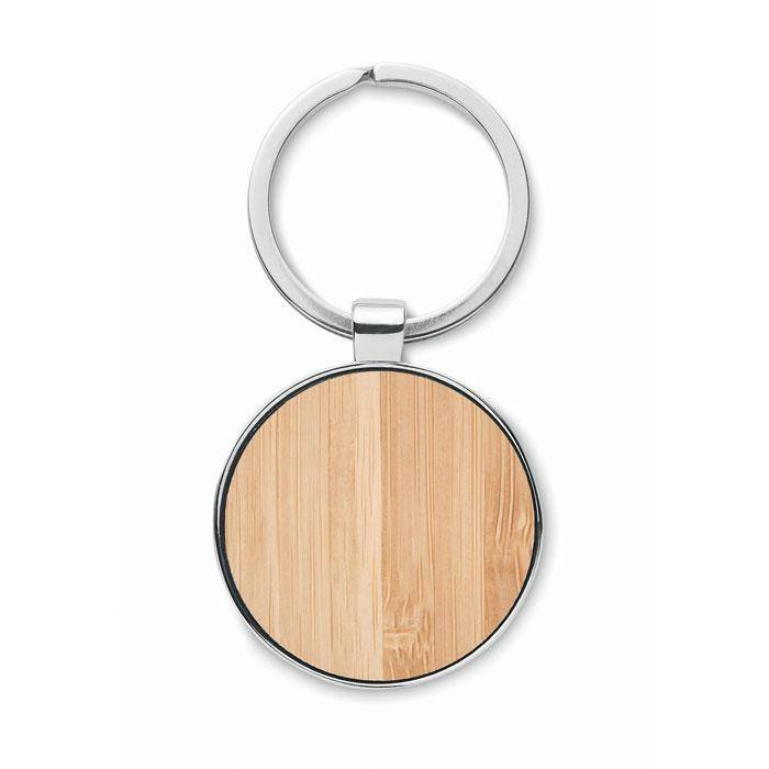 Okrągły brelok ze stopu cynku oraz z bambusem.