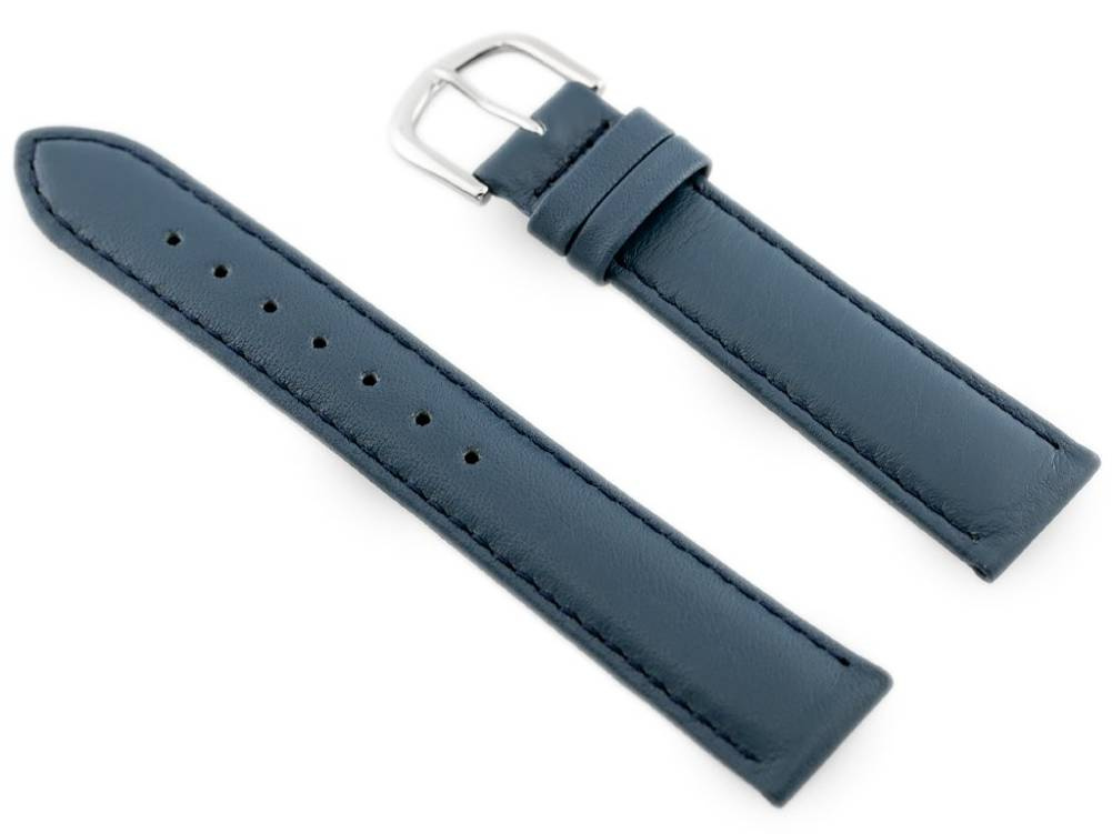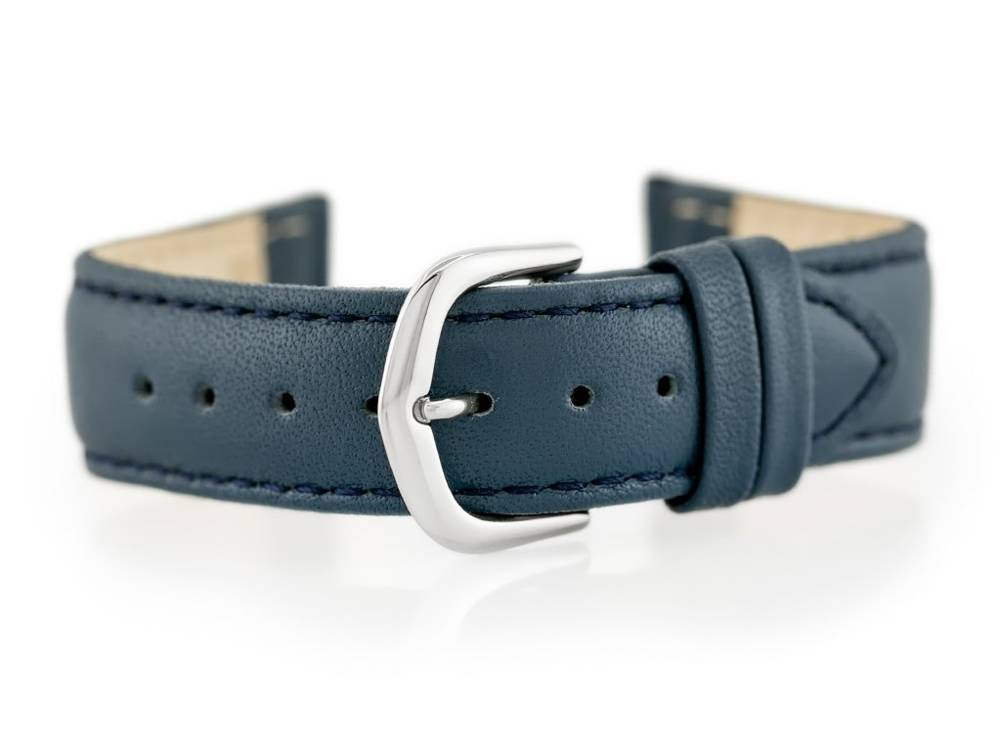 Pasek ze skóry naturalnej w kolorze ciemnoniebieskim z ciemnoniebieskimi przeszyciami. Klamerka ze stali szlachetnej w kolorze srebrnym.