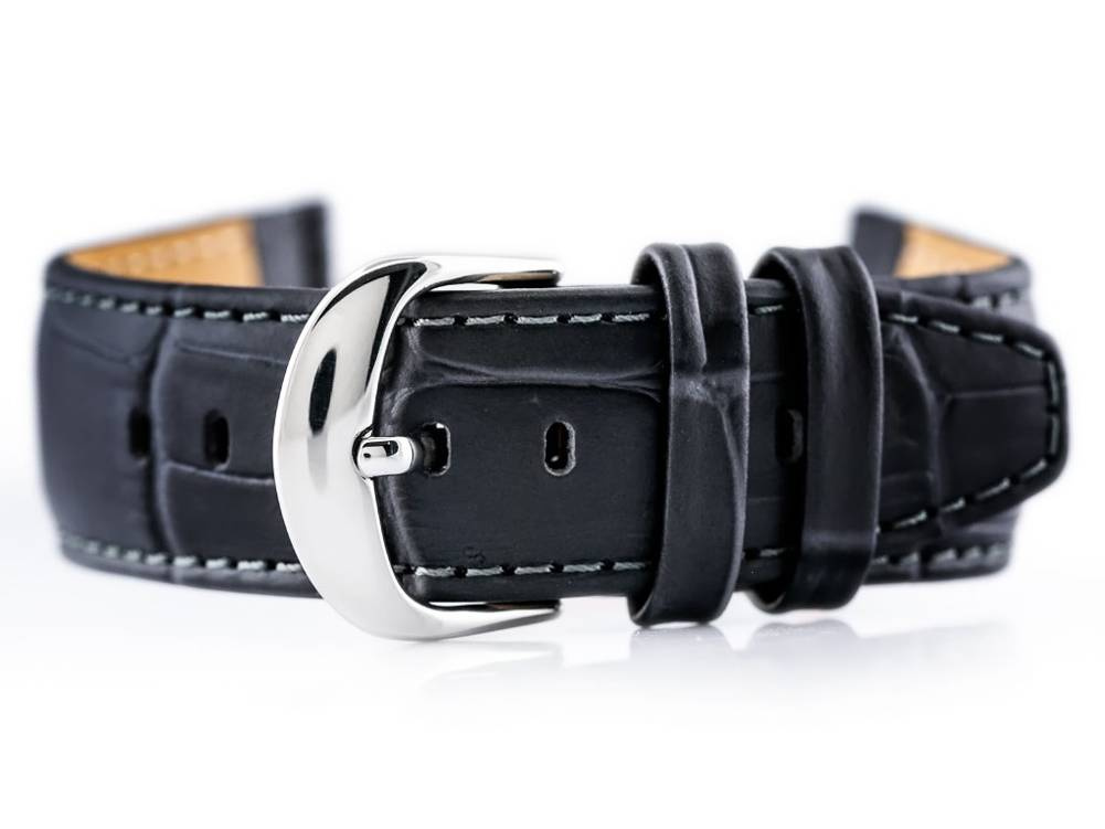 Pasek ze skóry naturalnej w kolorze grafitowym z grafitowymi przeszyciami. Klamerka ze stali szlachetnej w kolorze srebrnym.