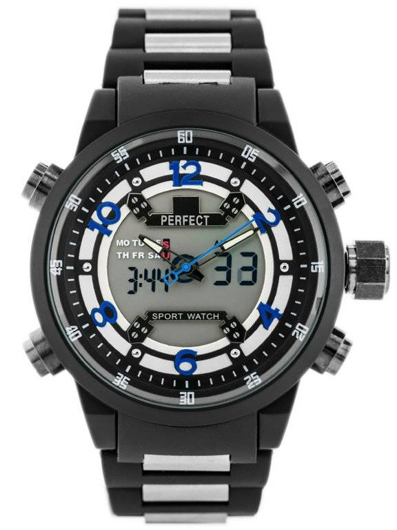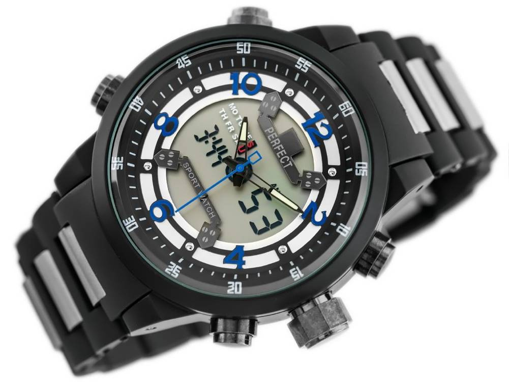 Kolorystyka: Tarcza w kolorach czarnym i srebrnym, koperta w kolorze czarnym, bransoleta w kolorze czarnym z srebrnymi metalowymi wstawkami, cyfry w kolorze niebieskim