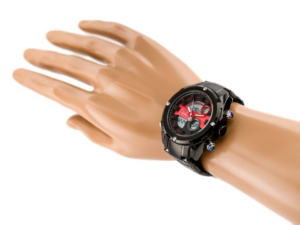 Kolorystyka: tarcza w kolorach grafitowym i czerwonym, bransoleta i koperta w kolorze czarnym, ring w kolorze czarnym