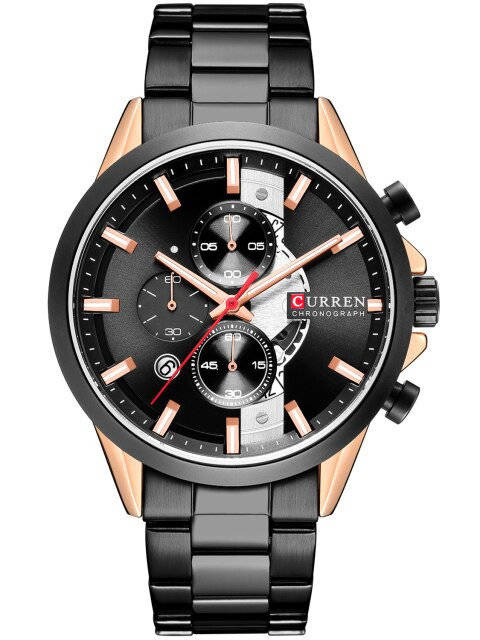 Zegarek męski CURREN 8325 to elegancki męski zegarek idealny zarówno do eleganckiego ubioru, jak i do noszenia na co dzień. Na czarnej tarczy z indeksami w kolorze różowego złota znajdziemy datownik dnia miesiąca oraz subtarcze będące wskazaniami chronografu i czasu dobowego.