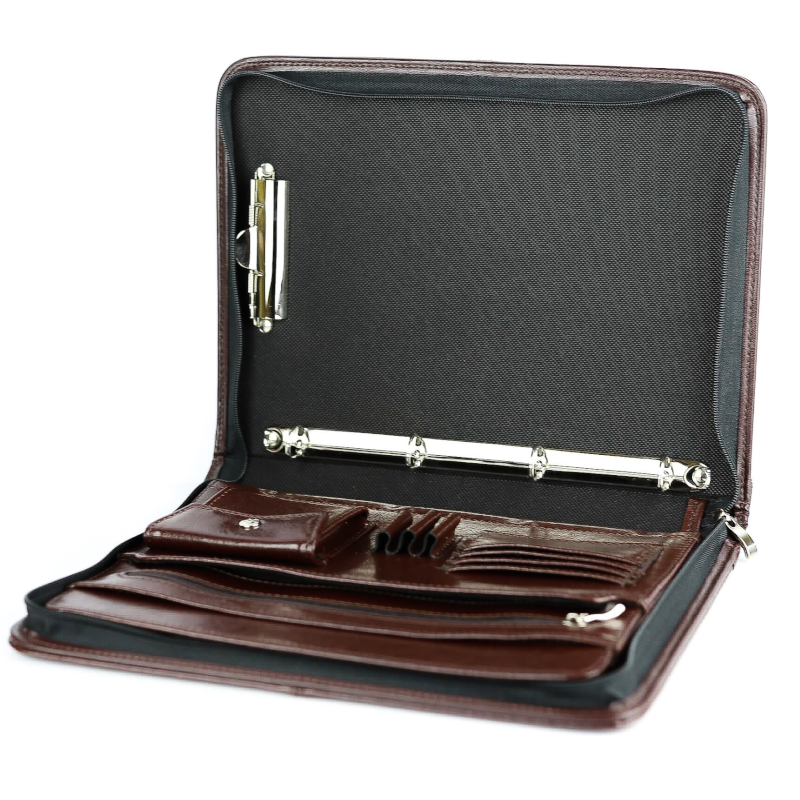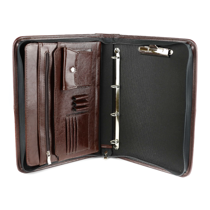 Na drugiej ściance aktówki znajduje się specjalny clip i ring do wpięcia Twoich dokumentów. Całość zapinana jest na zamek.