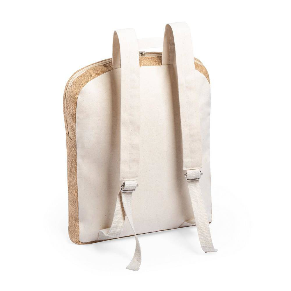 Plecak z przegrodą główną i przednią kieszenią na zamek błyskawiczny, wykonany z laminowanej juty i z bawełnianymi elementami