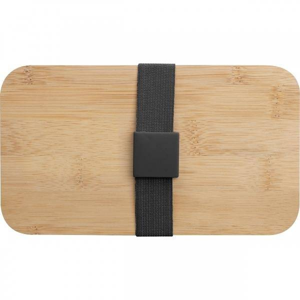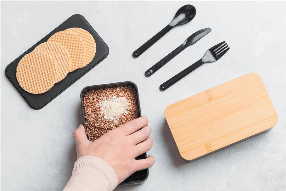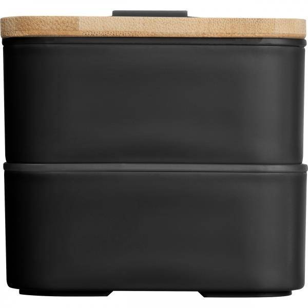Dwupoziomowe pudełko na lunch z dwiema osobnymi przegrodami (obie z własną przykrywką), bambusową pokrywką i przekładką (do oddzielania poszczególnych części posiłku w obrębie jednej przegrody). Bambusową pokrywkę można wykorzystać jako deseczkę do krojenia lub outdoorowy talerzyk. W zestawie znajdziemy również nóż, widelec oraz szeroką gumkę, zespajającą wszystkie elementy tego pudełka śniadaniowego.