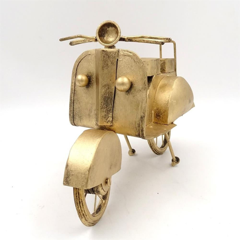Metalowy model Skutera Retro przypadnie do gustu miłośnikom jednośladów podbijających ulice miast. Skuter w starym stylu będzie ciekawą ozdobą biura lub mieszkania fana motoryzacji i legendarnej Osy lub Vespy. Model wykonany jest z metalu i wykończony w kolorze zabytkowego mosiądzu.
