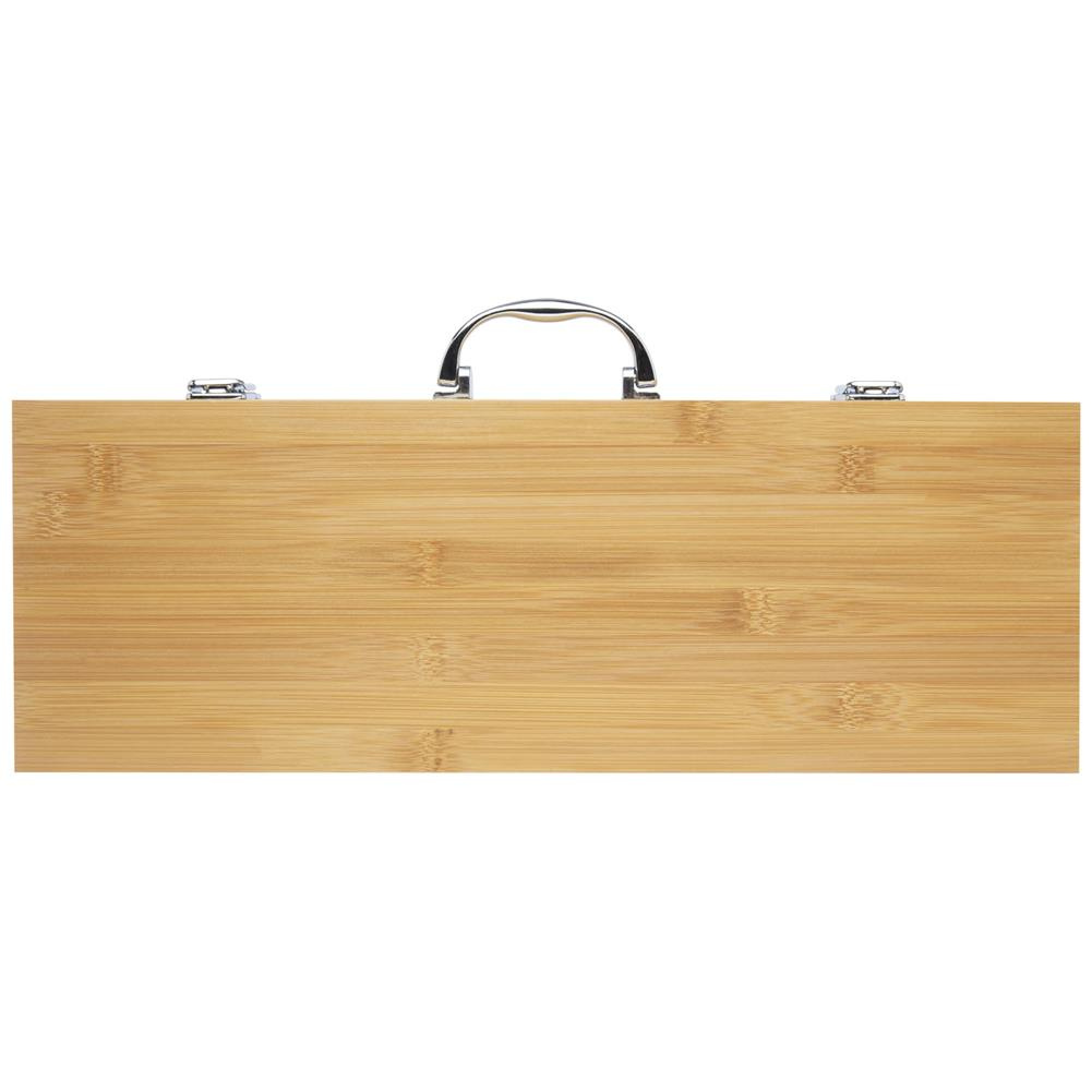 Bambusowy, 5-częściowy zestaw do grillowania z łopatką (40 x 9,5 cm), szczypcami (34,5 x 6 cm), widelcem (38,5 x 3 cm), nożem (38,5 x 3 cm) i szczotką (38 x 4,3 cm). Zestaw jest dostarczany w bambusowym pudełku upominkowym (46 x 16,2 x 7,4 cm). Uchwyty i pudełko upominkowe są wykonane z bambusa, który jest pozyskiwany i produkowany zgodnie z zasadami zrównoważonego rozwoju.