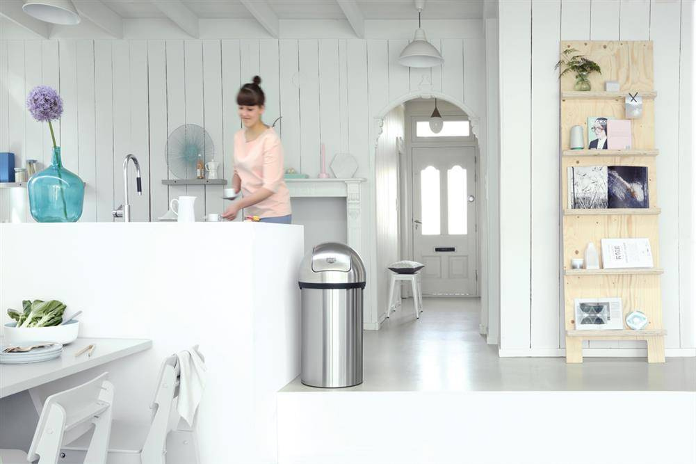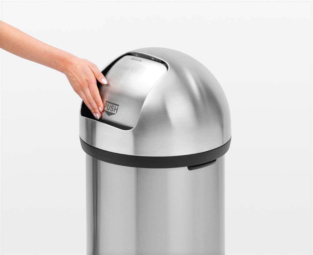 Kosz na śmieci z serii Push Bin o pojemności 60 litrów. Posiada cichą pokrywę, oraz duży otwór, ułatwiający wyrzucanie śmieci i odpadów, minimalizując ryzyko rozlania lub rozsypania. Kosz posiada ochronny pierścień w podstawie, zapobiegający uszkodzeniu podłogi. Gwarancja 10 lat.
