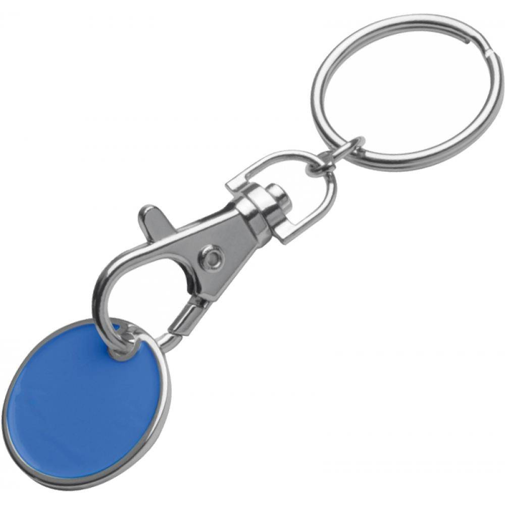 Metalowy brelok z karabińczykiem i żetonem do wózka na zakupy.