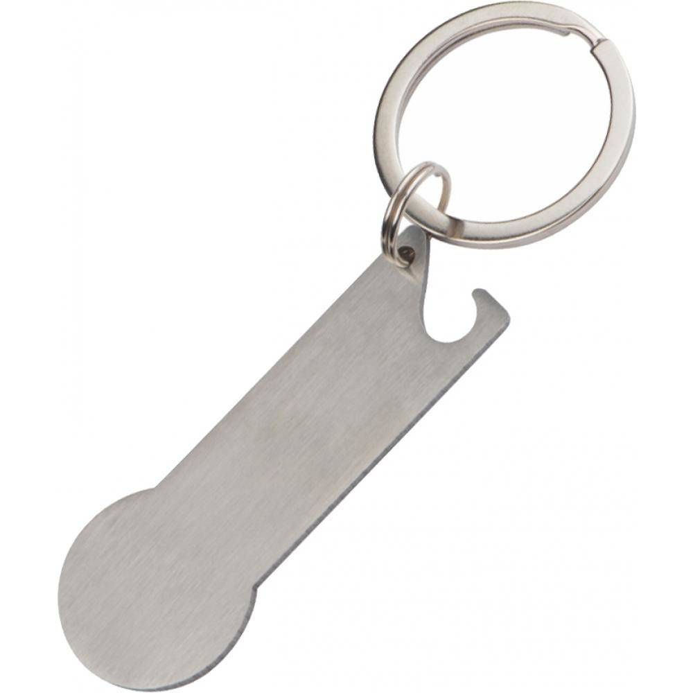 Metalowy brelok do kluczy z żetonem do wózka sklepowego i otwieraczem.