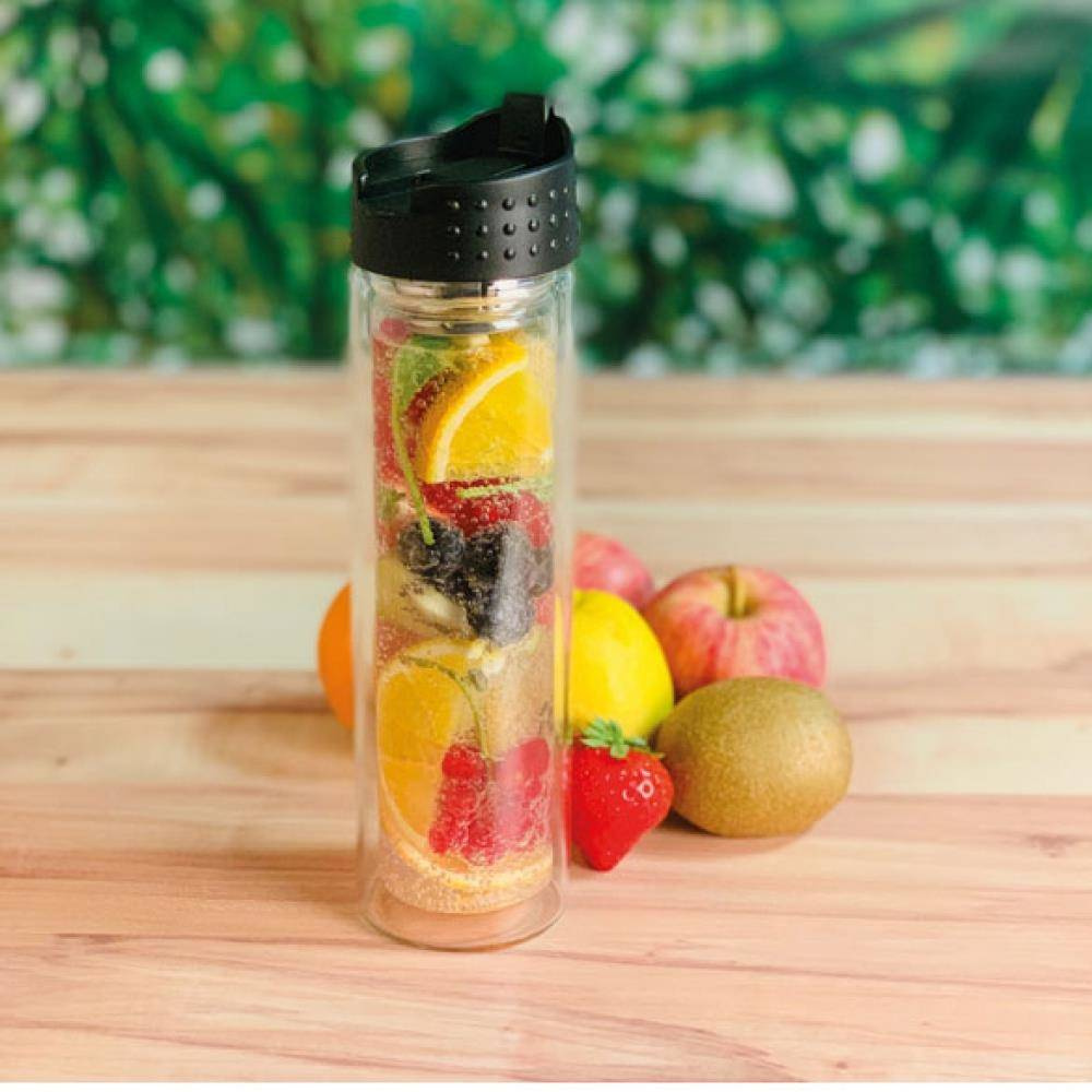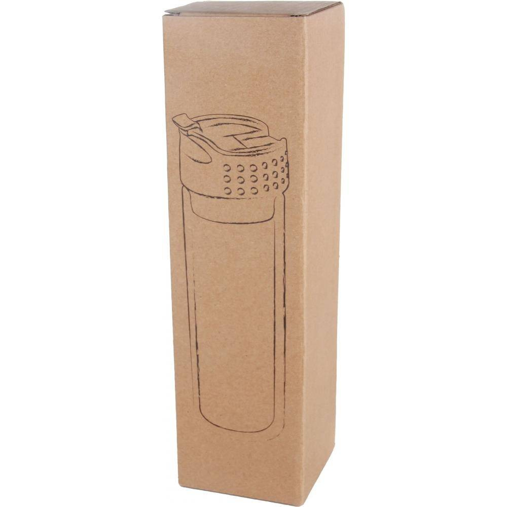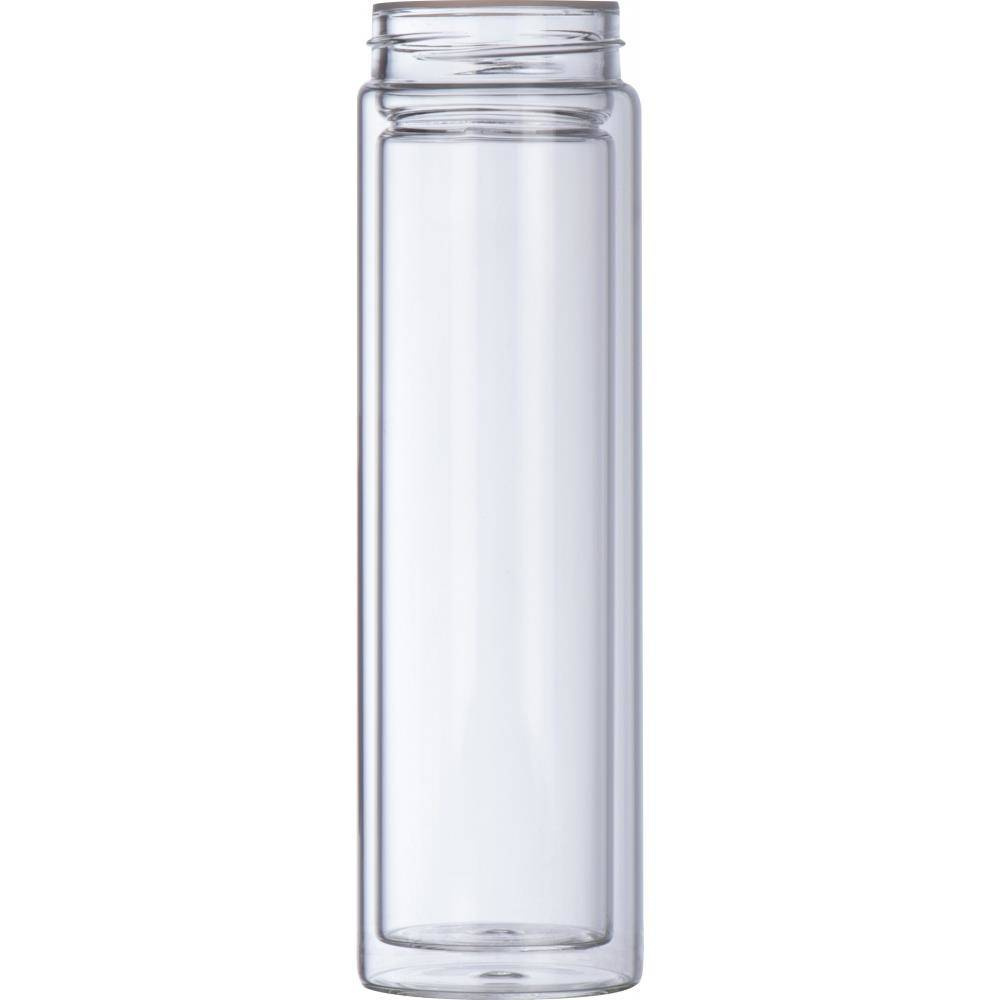 Butelka z podwójnymi ściankami, wykonana ze szkła, stali nierdzewnej i plastiku. Posiada sitko np. na herbatę. Pojemność 400 ml.