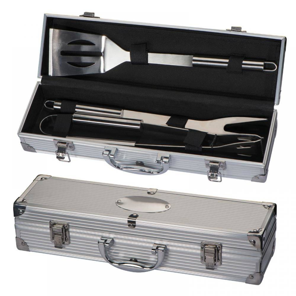 Zestaw metalowych przyborów do grilla (szczypce do obracania mięsa, łopatka i widelec) w metalowej skrzynce.