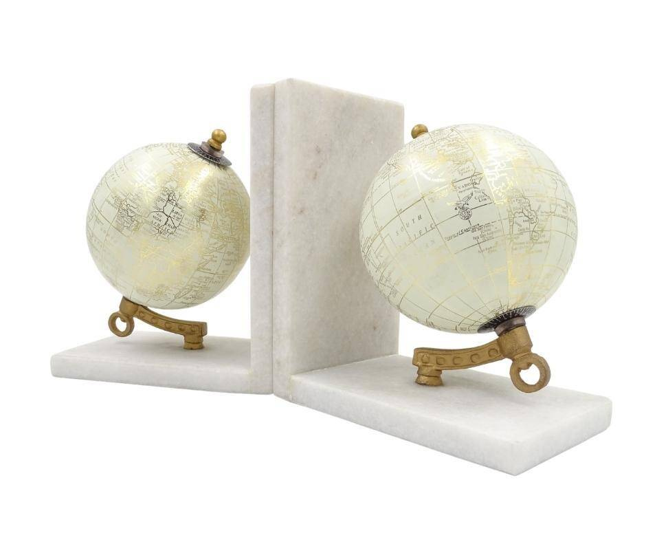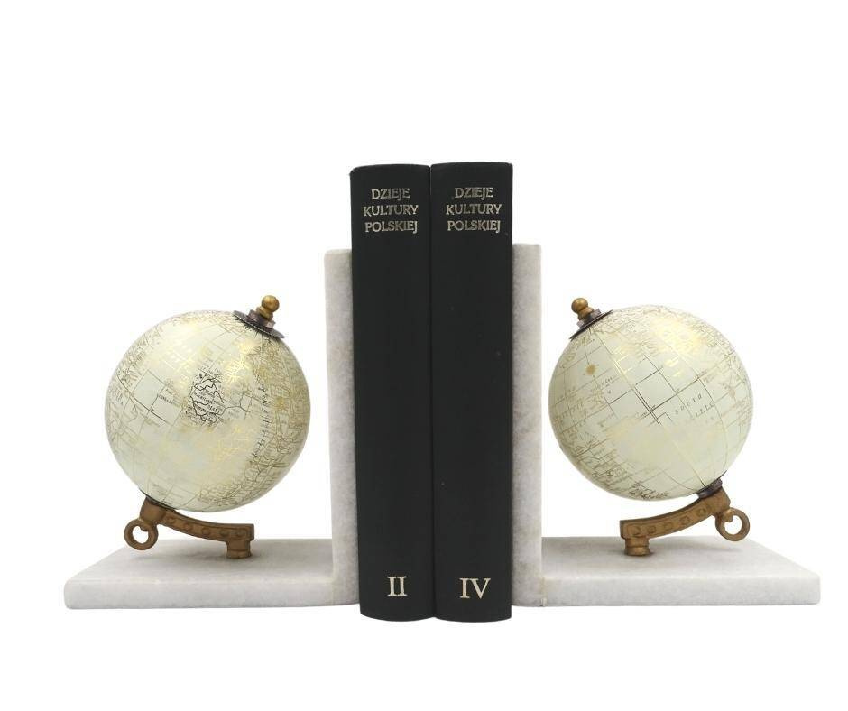 Podpórki do książek Globusy GLB-85 W zestawie 2 podpórki książek. Kolor: dominanta bieli, kontynenty złote Wymiary: wysokość 17,5 cm, podstawa 12,5 cm, średnica globusa - 10 cm