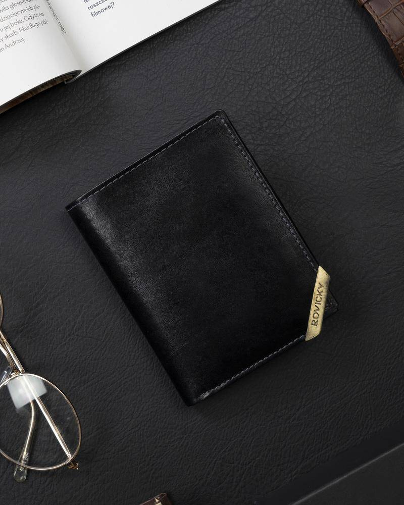 Pionowy portfel męski ze złotym akcentem, skóra naturalna licowa — Rovicky