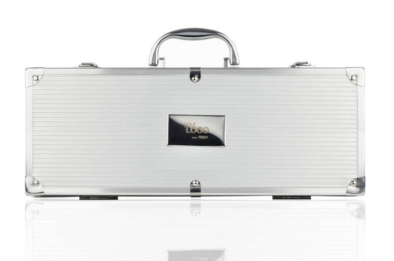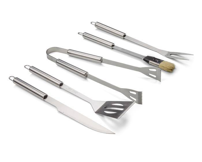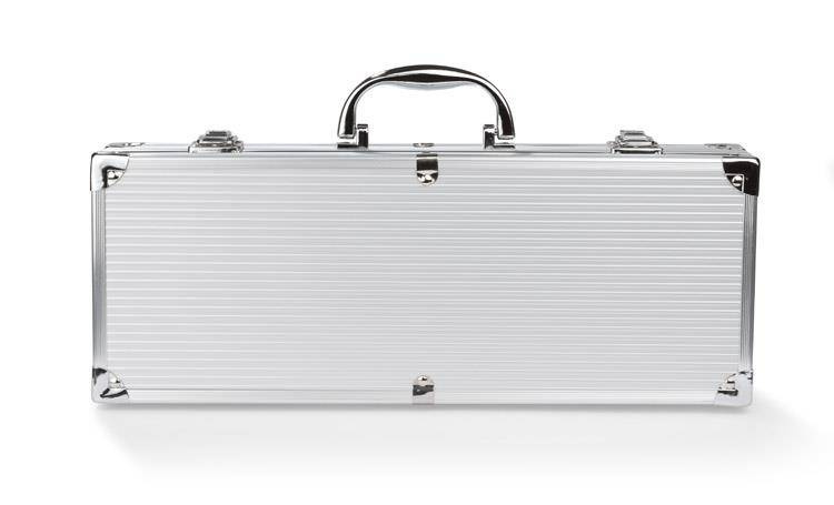 Zestaw do grilla pakowany w walizkę: szczypce, łopatka, nóż, widelec i pędzelek. Blaszka jest dołączona osobno.