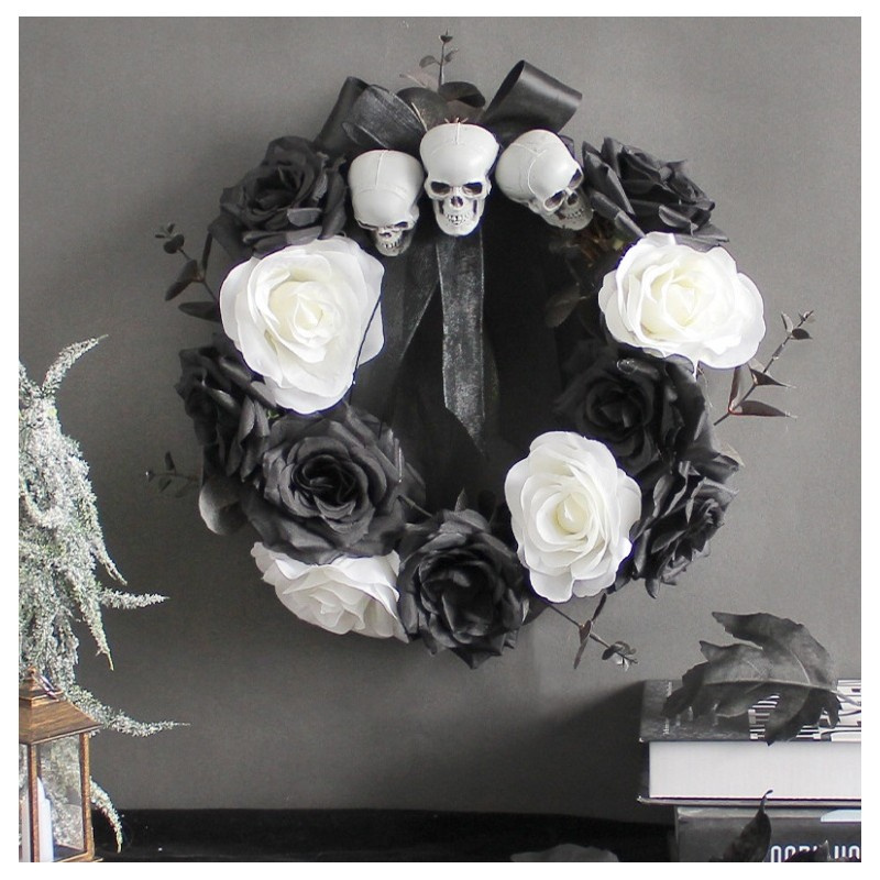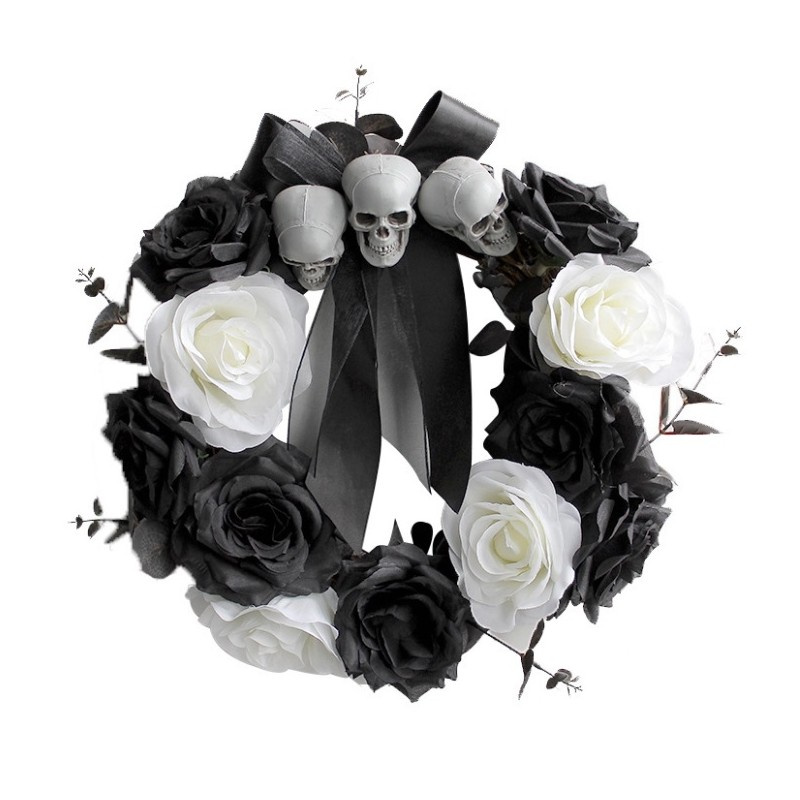 Ozdobna wiązanka na drzwi/stół HALLOWEEN Świetnie wykonana i bardzo przerażająca, Halloweenowa wiązanka.Idealna na stół lub drzwi, doda charakteru, dzięki ozdobnym czaszkom,oraz mrocznej kolorystyce. Wysokość: 35 cmSzerokość: 35 cmGłębokość: 10 cm