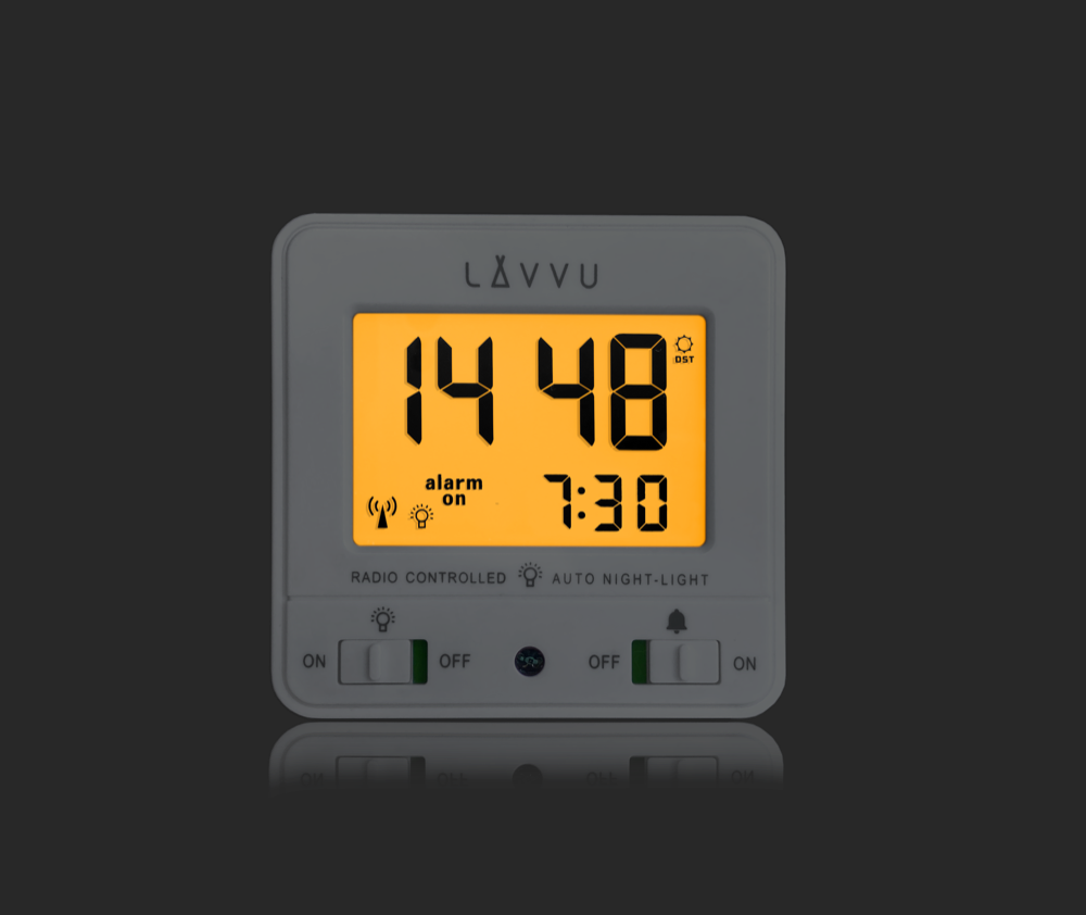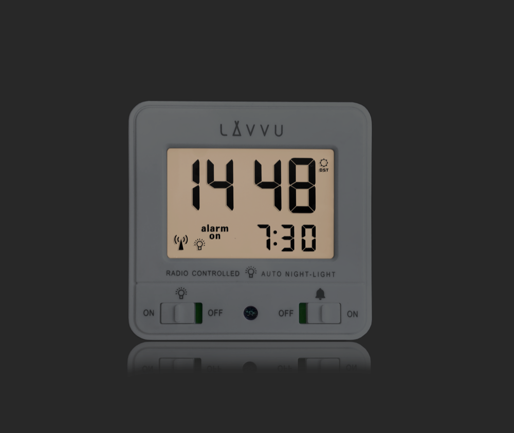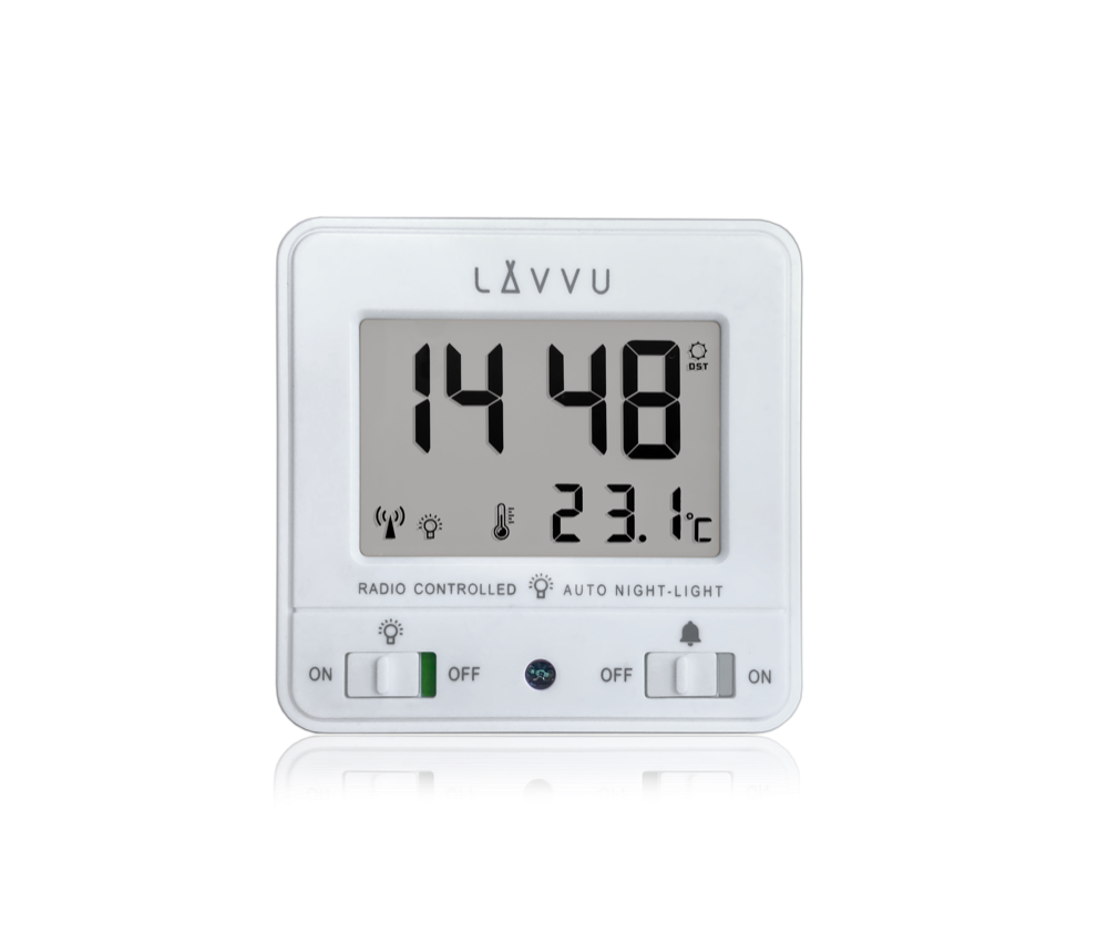LAVVU Cyfrowy budzik sterowany radiowo NORDLYS biały z czujnikiem światła