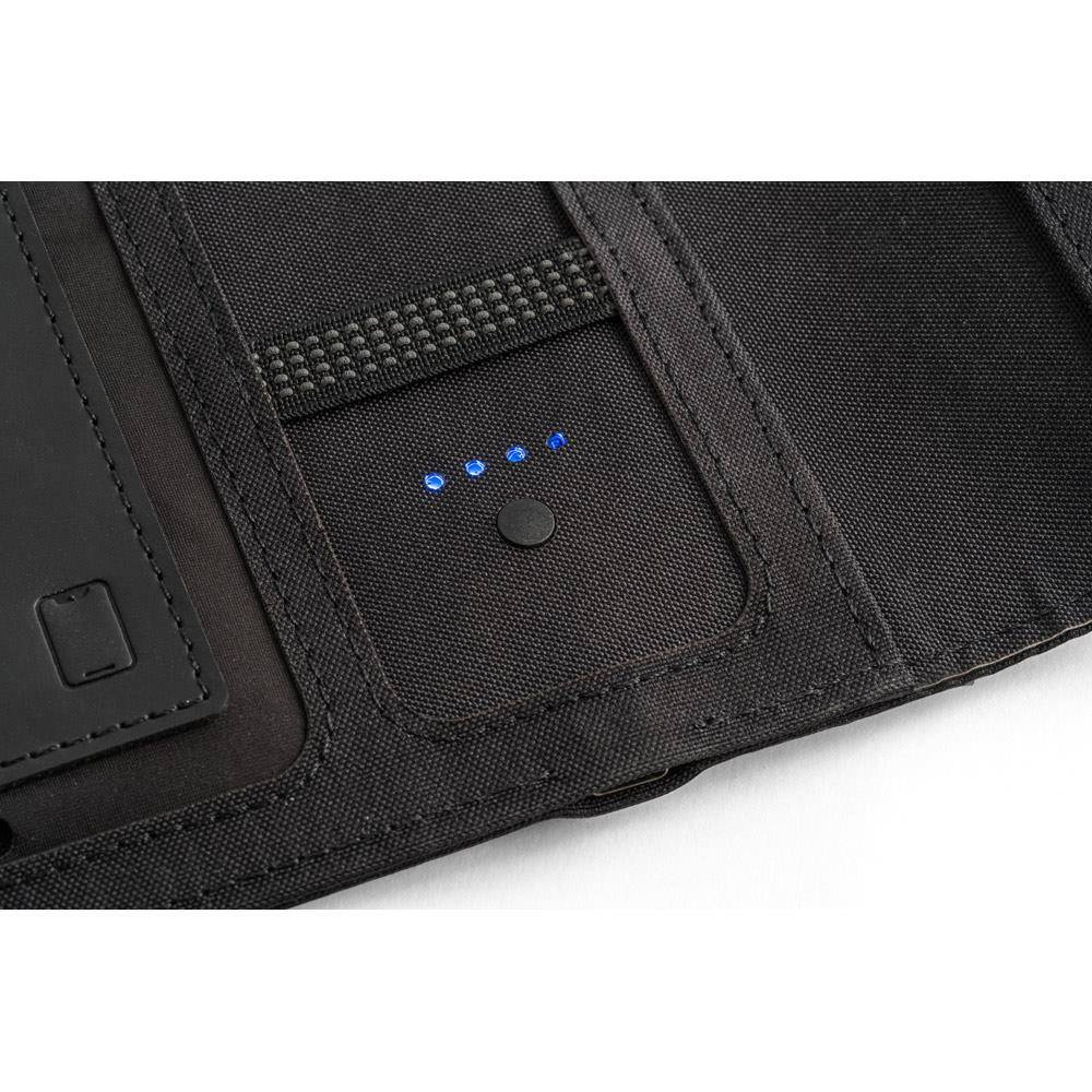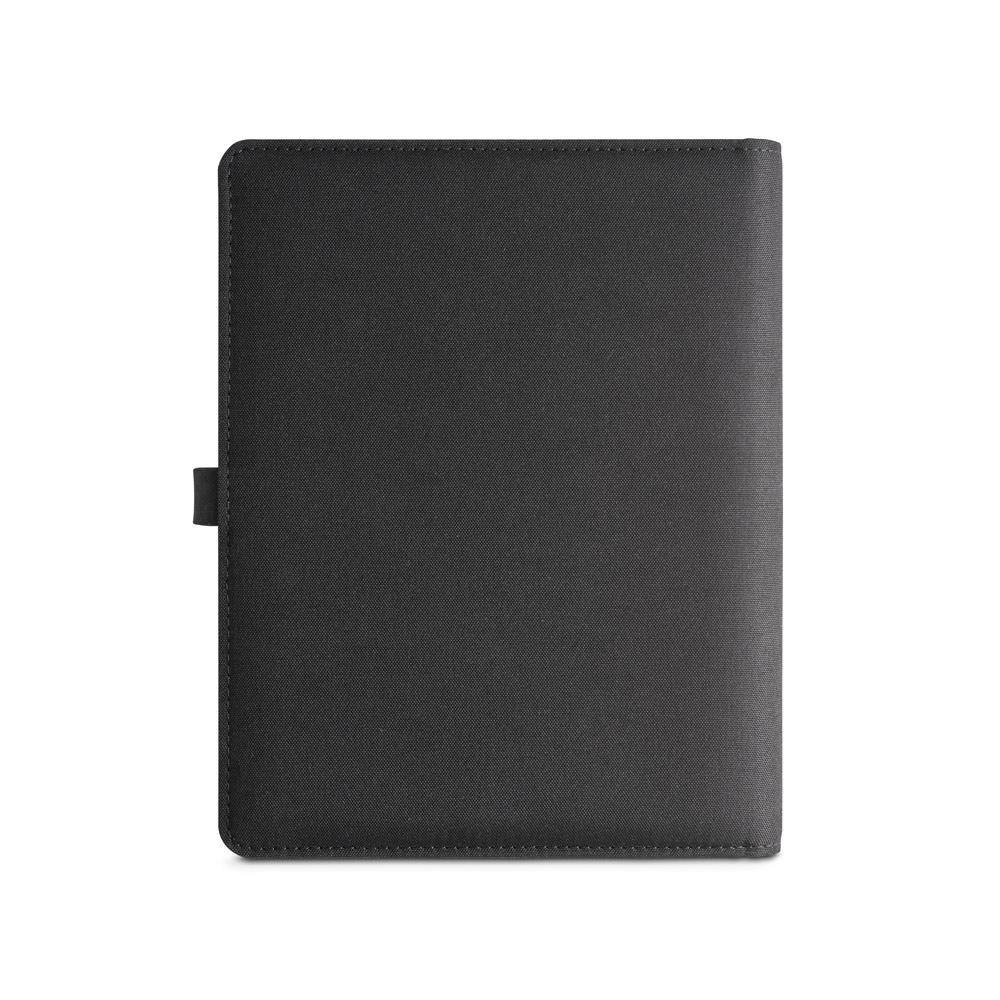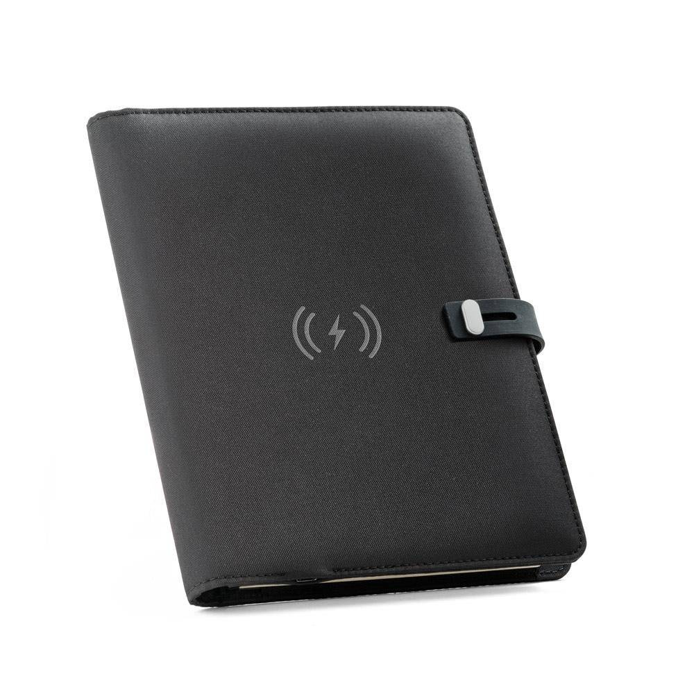 Teczka 300D rPET A5 z wbudowaną ładowarką bezprzewodową. Akumulator ma pojemność 5'000 mAh, moc 5 W, wejście/wyjście 5V/2.1A oraz kabel USB typu C do ładowania. Teczka posiada kieszeń na smartfona do 6.5'', 3 miejsca na karty, 4 diody LED, przycisk włączania/wyłączania, uchwyt na długopis (długopis nie jest dołączony), kabel do smartfona i USB, notatnik z czarną tekturową okładką i 64 kartkami w kolorze kości słoniowej z papieru pochodzącego ze zrównoważonej gospodarki leśnej. Z przodu znajduje się również owalny nadruk w kolorze czarnym wskazujący obszar ładowania bezprzewodowego. Dostarczany w kartonowym pudełku upominkowym. 165 x 225 x 25 mm