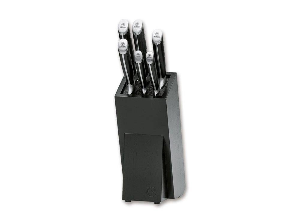 Linia noży kuchennych Boker Forge łączy innowacyjne i dynamiczne projekty z klasycznym doborem materiałów na najwyższym poziomie jakości. Atrakcyjne, przyciągające wzrok linie wzornicze odróżniają tę serię znacznie od mas przeciętnych noży kuchennych, nie będąc zbyt krzykliwymi. Ponadto seria Boker Forge przekonuje bardzo atrakcyjnym stosunkiem ceny do wydajności. Noże wykonane są ze stali nierdzewnej chromowo-molibdenowo-wanadowej X50CrMoV15, są idealnie wyważone i zapewniają doskonałą obsługę dzięki ergonomicznej konstrukcji rękojeści. Czarne okładziny rękojeści wykonane zostały z wysokiej jakości tworzywa sztucznego ABS, trwale połączone trzema nitami ze stali nierdzewnej i są przymocowane do całkowicie ciągłego trzpienia bez nitów. Konstrukcja ostrzy, łącznie z przejściem na wałek, umożliwia łatwe ostrzenie i zapewnia długoletnią, doskonałą funkcjonalność noży w połączeniu z odpowiednią pielęgnacją. Noże należy myć tylko ręcznie, nie myć w zmywarce. Co więcej, seria Boker Forge przekonuje niesamowicie atrakcyjnym stosunkiem ceny do wydajności.