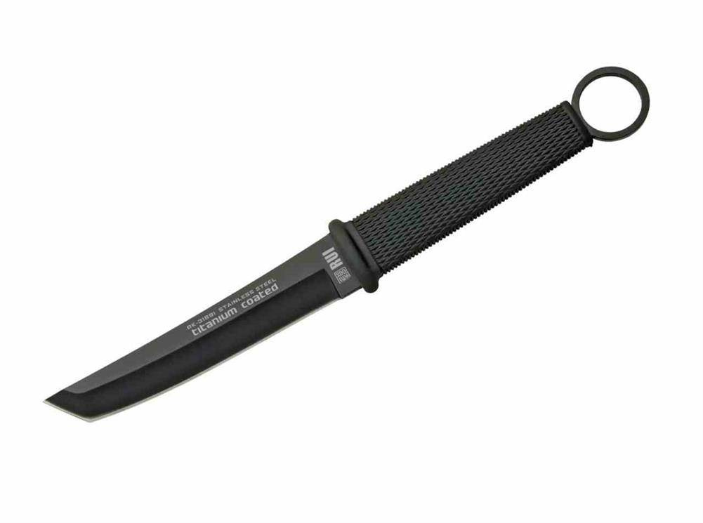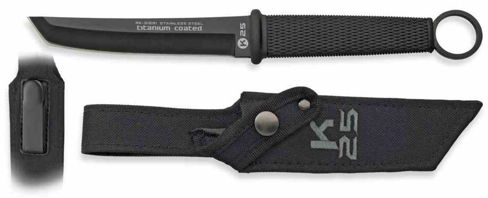 Głownia ze stali nierdzewnej z tytanową powłoką, długość całkowita 250 mm, długość klingi 123 mm, grubość klingi 3.8 mm,  waga 118 g, rękojeść z  gumy, w komplecie nylonowa pochwa z klipsem.