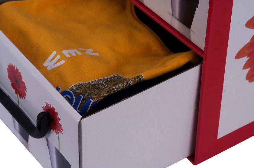 Wykonane z wysokiej jakości, wytrzymałego, kaszerowanego kartonu z połyskiem, w 100% pochodzącego z recyklingu. Sposób wykończenia kartonu pozwala na czyszczenie wilgotną ściereczką. Podwójnie ścianki boczne. Na każdej szufladzie uchwyty z PCF ułatwiają otwieranie. Intuicyjny i prosty montaż, zaprojektowane tak, aby maksymalnie ułatwiać montaż, a jednocześnie gwarantować najwyższą estetykę wykonania. Pudełko w całości wykonane we Włoszech.