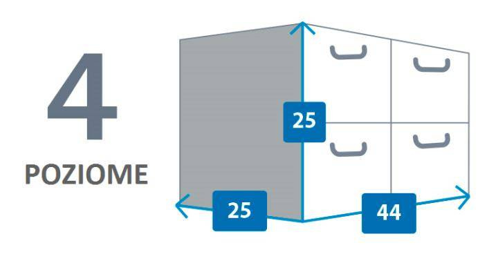 Produkt dostępny w czterech rozmiarach: 2 poziome szuflady, 2 pionowe szuflady, 4 poziome szuflady, 4 pionowe szuflady.