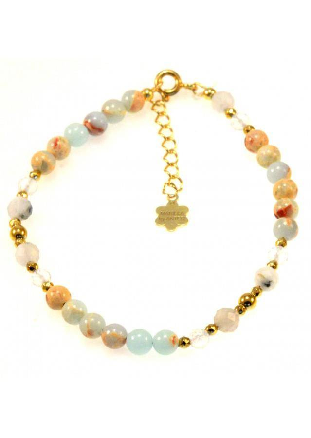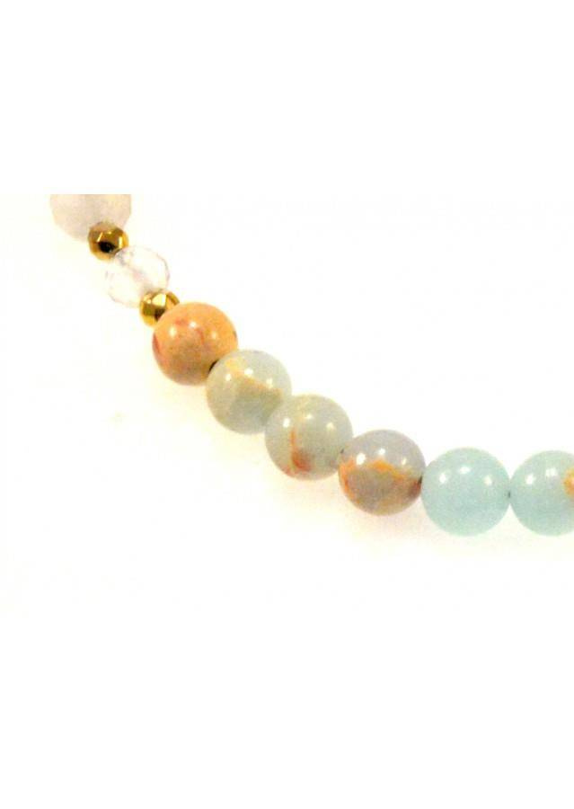 Bransoletka wykonana ze srebra próby 925 , pozłacanego 24 karatowym złotem Kamień: Kryształ górski, Jaspis Cesarski i Hematyt Rozmiar kamienia: 2mm / 3mm Długość: 17,5 cm + przedłużka do