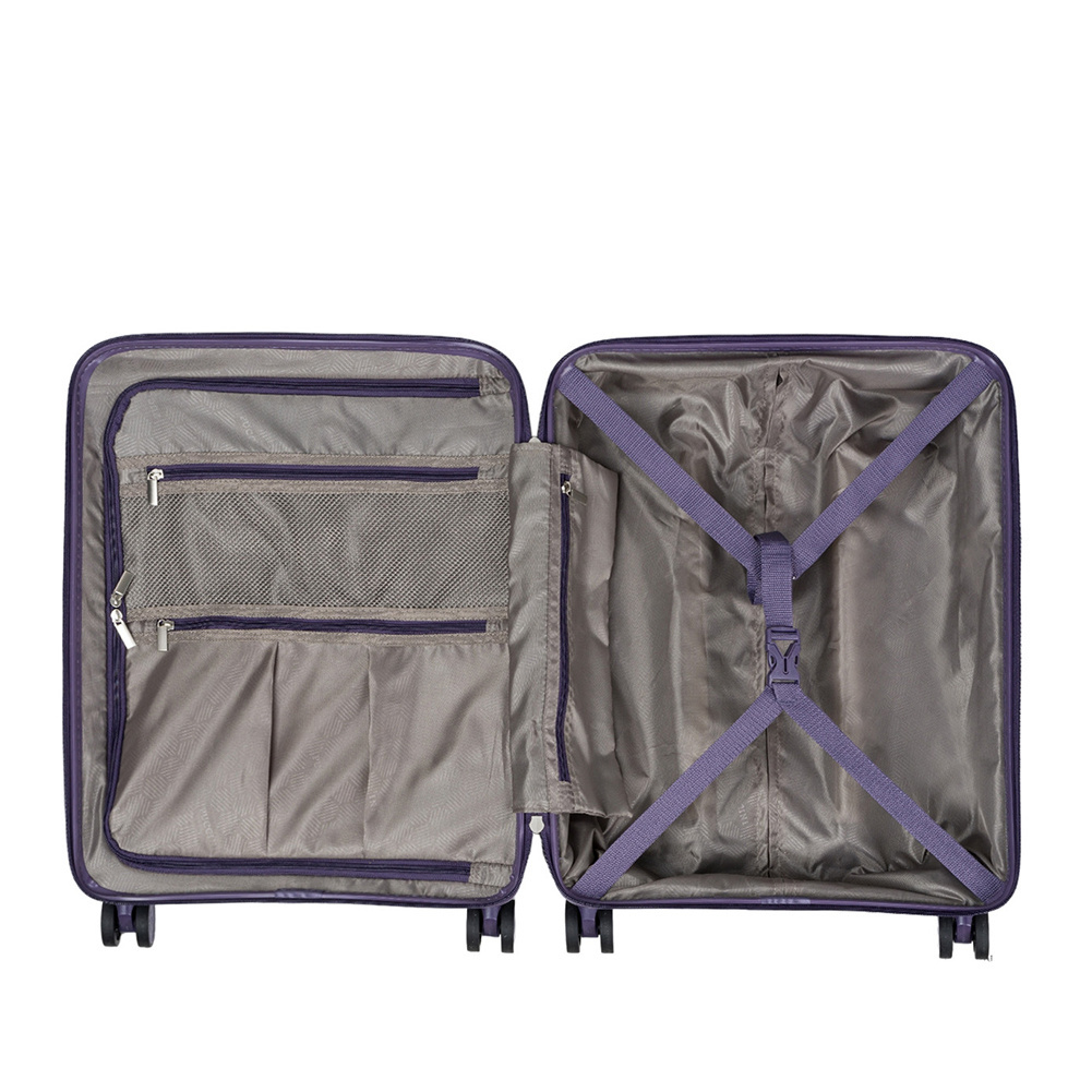 - walizka twarda wykonana z polipropylenu, materiału charakteryzującego się super lekką wagą i niezwykłą wytrzymałością
