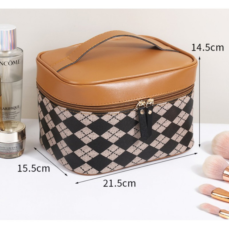 Modny dodatek na podróż - rozkładana kosmetyczka z pięknym wzorem! Piękna, damska rozkładana kosmetyczka, dostępna w kolorze brązowym z geometrycznymi wzorami.