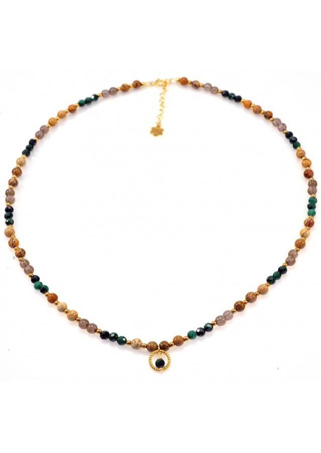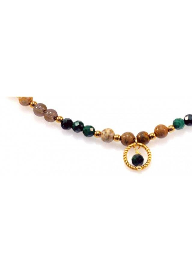 Naszyjnik wykonana ze srebra próby 925, pozłacanego 24 karatowym złotem. Kamień: Malachit, Kwarc Dymny i Hematyt Rozmiar kamienia: 3mm / 4mm Długość: 44 cm  Długości do wyboru: 38 cm /42 cm/ 44 cm Zapięcie: klasyczne (federing) Biżuteria ręcznie wykonana, produkt Polski.
