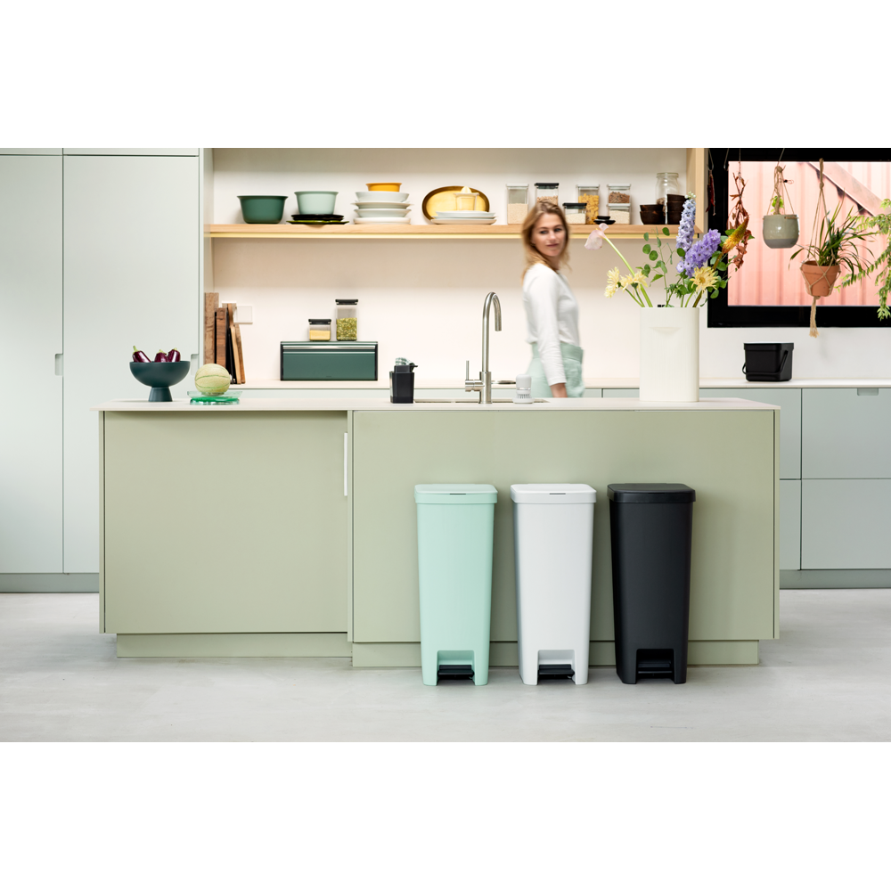 Przyspiesz recykling dzięki koszowi Brabantia StepUp 40L! Wykonane w 91% z odpadów pochodzących z recyklingu i przeznaczonych do recyklingu! Z zatrzaskowym uchwytem na etykiety i poręcznym schowkiem na worki wewnątrz kosza. Jeśli kochasz recykling, z pewnością pokochasz ten kosz.