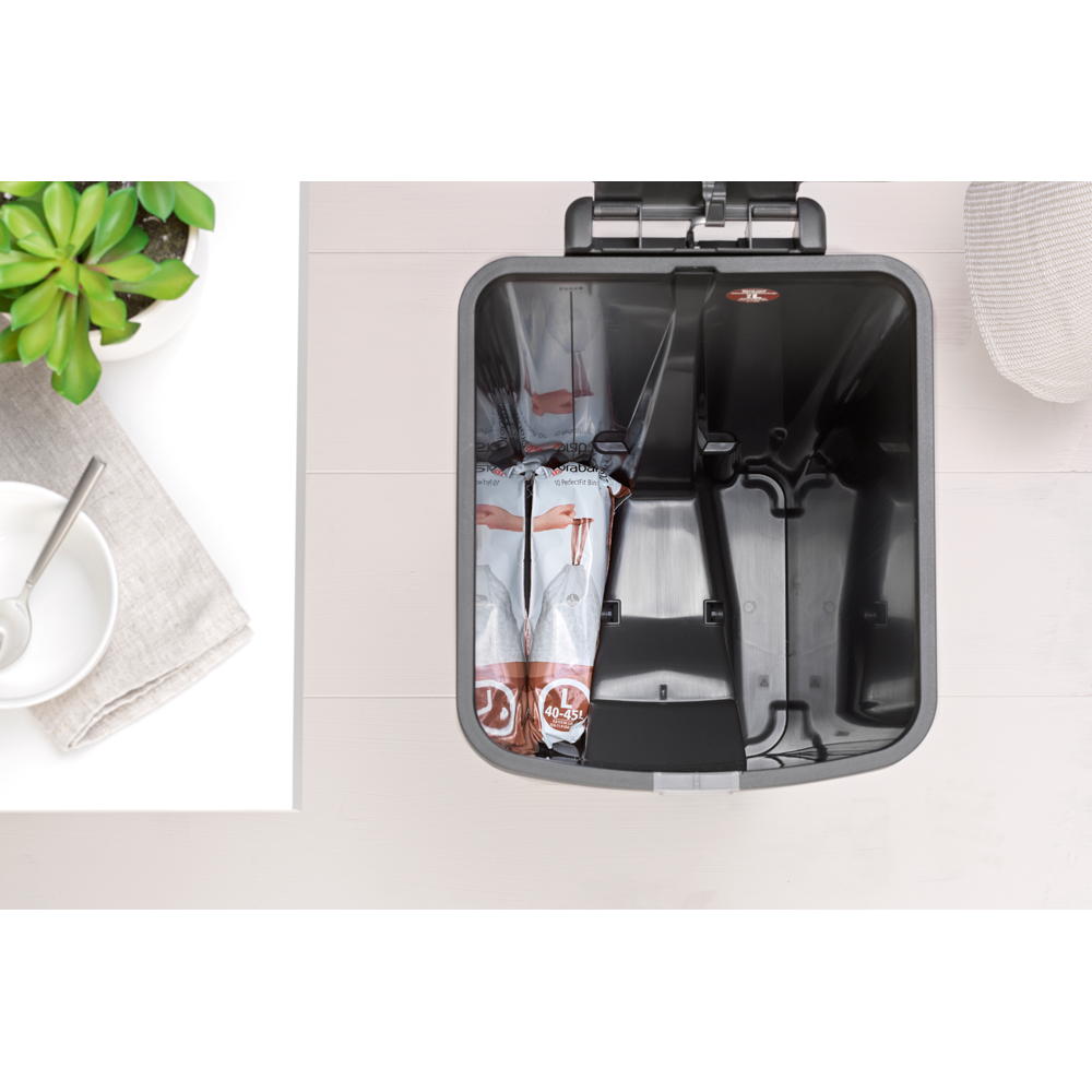 - Brak brzydkiego zawijania — dostępne pasujące worki na śmieci Brabantia PerfectFit z taśmą krawatową (rozmiar L).