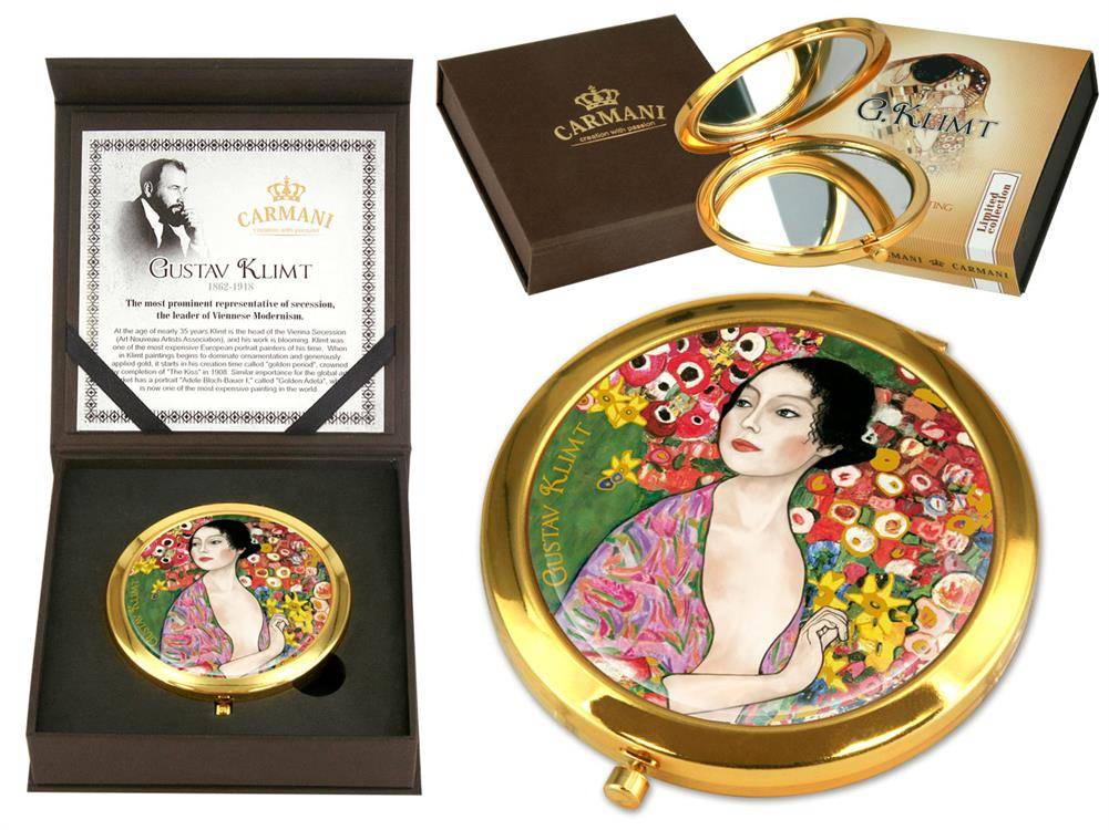 Urocze, małe lustereczko z motywem twórczości Gustava Klimta. Doskonałe do każdej kobiecej torebki. Zajmuje mało miejsca a jego piękne zdobienia dodają uroku.