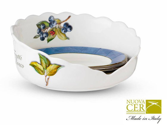 Urokliwa miska na owoce wykonana z ceramiki o bardzo delikatnym. kremowym odcieniu. ozdobiona soczystymi owocami leśnymi. Jeżyny. porzeczki i jagody. które rosną w lesie ukryte między kłującymi krzewami kontrastowo są symbolem wielkiej słodyczy i rów