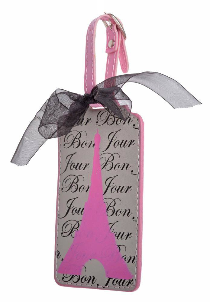 Zawieszka na bagaż z różową wieżą Eiffla, na pasku z klamerką przewiązanym czarną, tiulową wstążeczką. Z tyłu tabelka z możliwością wpisania danych adresowych. Wymiary bez paska: 13x7cm.