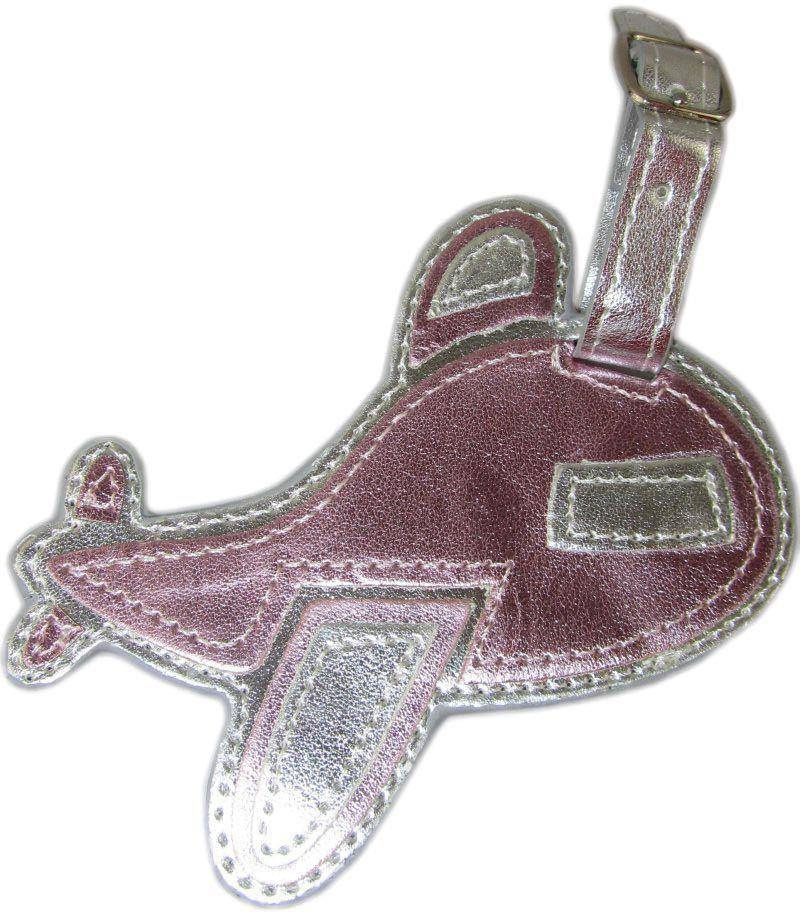 Różowo - srebrna zawieszka na bagaż - samolot. Z tyłu tabelka z możliwością wpisania danych adresowych.