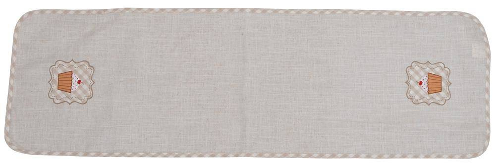 Bieżnik wykończony lamówką w kratę, z wyhaftowanymi muffinkami.