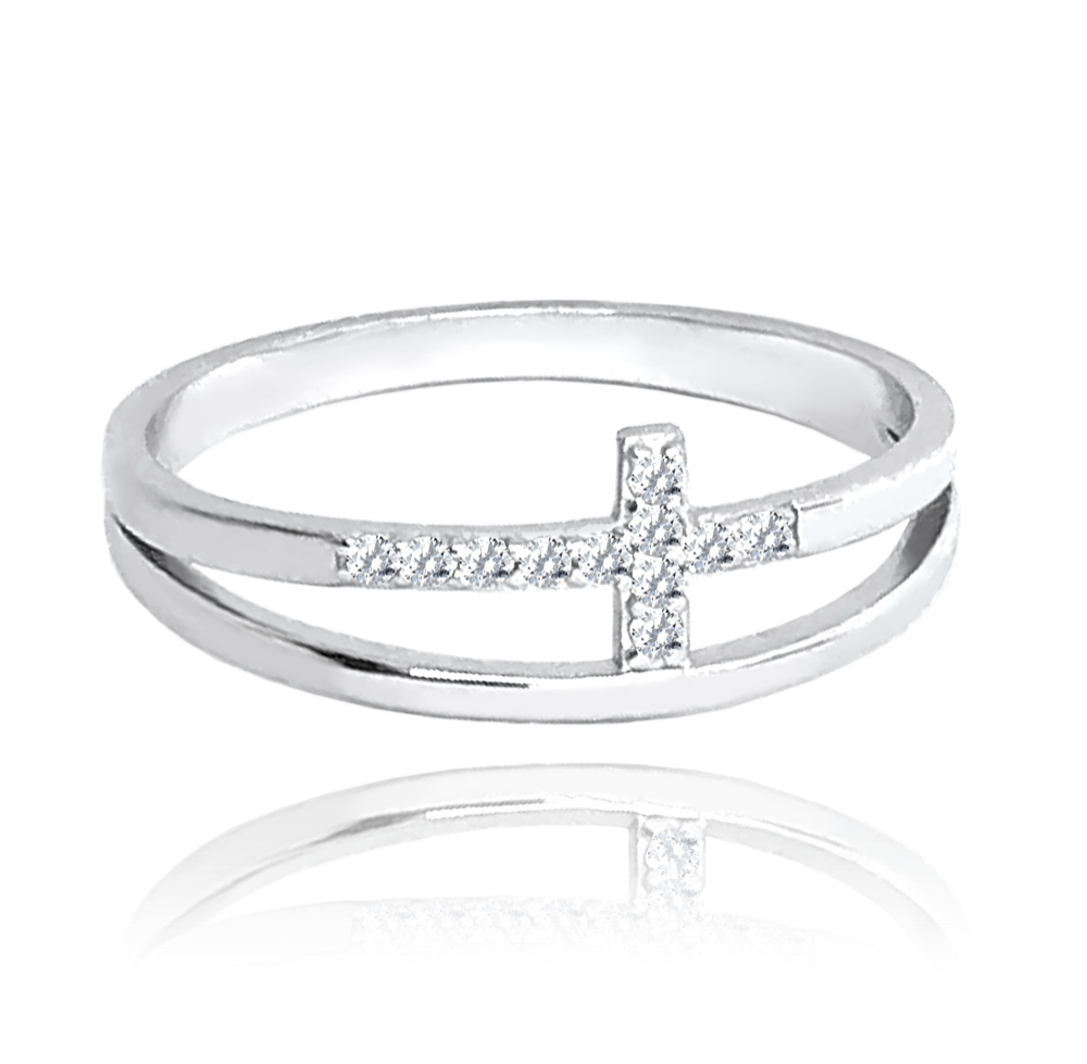 MINET Podwójny pierścien srebrny KRZYŻ z białymi cyrkoniami wielkość 20