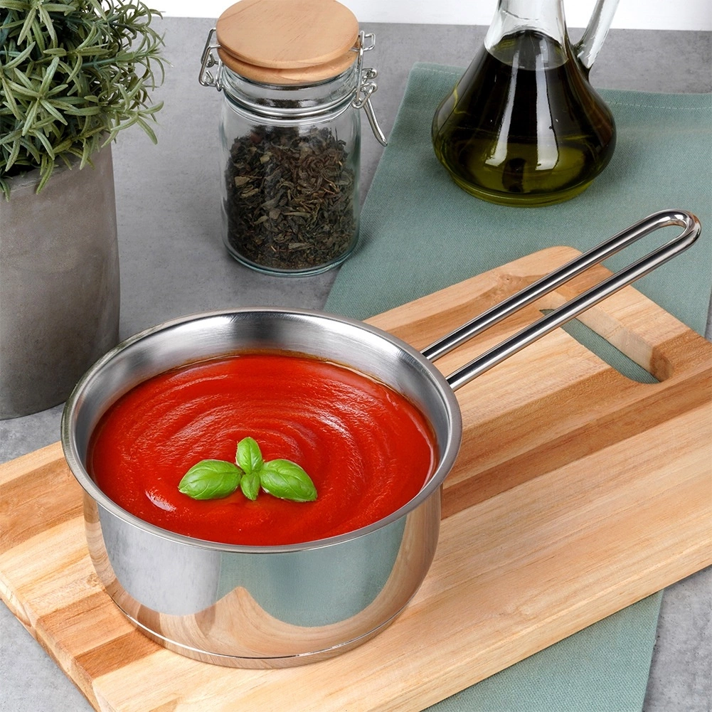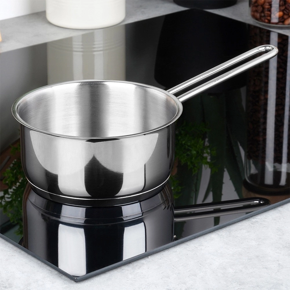 - Garnek wykonany z wysokiej jakości stali nierdzewnej . Dno akutermiczne wielowarstwowe, uchwyt stalowy. Nadaje się na każdy rodzaj kuchenek - również indukcję.